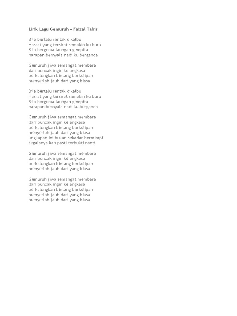 Gemuruh jiwa semangat membara dari puncak ingin ke angkasa berkalungkan bintang berkelipan. Di dalam kelambu Menunggumu dia kesali Hilang bayangan Pedoman ikhtiar dan arah Persis si buta mengangankan Hidup. Lirik Lagu Gemuruh Faizal Tahir.
